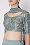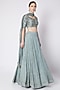Featuring an aqua blue lehenga for girls in kasturi crepe base with zardosi jaal embroidery. It is paired with a matching blouse in raw silk base and a georgette dupatta.