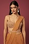 Featuring a burnt orange pre-stitched saree for girls in georgette base with embroidery. It is paired with a matching blouse and a belt.