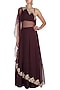 Featuring a wine crop top for girls in silk base. It is paired with a matching skirt and an organza asymmetrical embroidered cape.