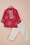 Featuring a pink kurta for boys in viscose silk base with embroidery. It is paired with ivory pyjama pants. Style it with mojaris and a watch for a wedding or festive occasion.