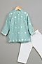 Featuring a sea green kurta for boys in viscose silk base with embroidery. It is paired with ivory pyjama pants. Style it with mojaris and a watch for a wedding or festive occasion.