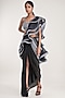 Featuring a black ruffled saree in pure natural crepe base. it is paired with a matching leather blouse having holographic print and a pure organza drape.