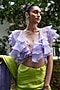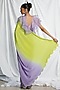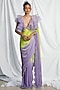 Featuring a lavender and neon scalloped saree in bemberg satin base. It is paired with a ruffled embellished blouse. Accentuate with dangler earrings and heels for cocktail events.