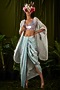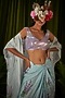 Featuring a light blue cape in upada silk base with floral print. It is paired with a matching printed draped skirt and a PU sequins holographic blouse.