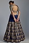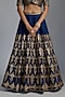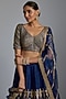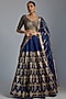 Featuring a blue lehenga in raw silk base with aari embroidery. It is paired with a matching blouse and a silk organza embroidered dupatta.
