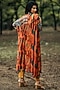 Featuring an orange anarkali in khadi and georgette base with tassels and print. It is paired with contrasting pants.