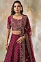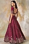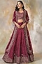 Featuring a wine lehenga in raw silk and net base with peeta dabka, crystals, cutdana, sequins, and swarovski hand embroidery, including a cancan. It is paired with a matching blouse having cutwork detailing and a dupatta.