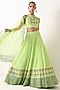 Featuring a mint green lehenga in pure georgette base with sequins and cutdana hand embroidery including block print. It is paired with a matching halter neck blouse and an organza dupatta.