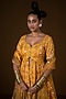 Featuring a mustard and olive ombre front-open kurta in summer silk and organza base with floral motifs, 3D sequins and coin embroidery. It is paired with matching embroidered sharara pants and a dupatta.