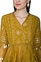 Featuring a mustard yellow chikankari angrakha kurta in sheer organza base with hand painting. It is paired with matching sharara pants.