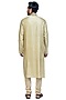 Featuring an oyster colored kurta in dupion moonga silk and viscose base with hand embroidery. It is paired with contrasting churidar pants in cotton silk base.