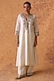 Featuring an ivory kurta in chanderi base with zardosi embroidery. It is paired with embroidered pants and an organza embroidered dupatta. Accentuate the set with polki dangler earrings and block heels for an elegant look, Perfect for a festive occasion or sangeet ceremony.
