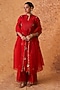 Featuring a red kurta in chanderi base with zari and sequins embroidery. It is paired with embroidered scalloped pants and an organza embroidered dupatta. Accentuate the set with polki dangler earrings and block heels for an elegant look, Perfect for a festive occasion or sangeet ceremony.