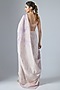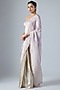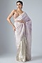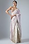Featuring a lilac and silver saree in handwoven Jacquard tissue, mashroo and tissue base with shibori detailing and aari embroidery. It is paired with a blouse and a belt. Style this saree with polki stud earrings, soft curls and metallic heels for a weddings, pooja or sangeet ceremonies.