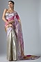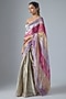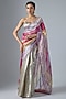 Featuring a multi-colored saree in jacquard tissue base with color-block detailing and aari embroidery. It is paired with a corset blouse. Style this saree with polki stud earrings, soft curls and metallic heels for a weddings, pooja or sangeet ceremonies.