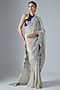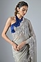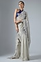 Featuring a silver saree in habutai silk base with cutwork and aari embroidery. It is paired with a dark blue tussar silk blouse. Style this saree with polki stud earrings, soft curls and metallic heels for a weddings, pooja or sangeet ceremonies.