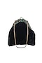 Featuring a black box clutch in velvet base with green gemstone embellishments. It has a shantoon underlining and a detachable chain handle.