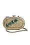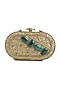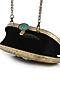 Featuring a dull gold capsule clutch in brass base with malachite gemstones embellishments. It has a black velvet underlining and a detachable chain handle.