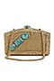 Featuring a dull gold clutch in brass base with turquoise gemstones embellishments. It has a black velvet underlining and a detachable chain handle.