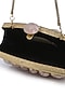 Featuring a dull gold clutch in brass base with rose quartz gemstones embellishments. It has a black velvet underlining and a detachable chain handle.