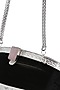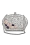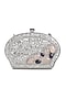 Featuring a silver shell clutch in brass base with rose quartz gemstones embellishments. It has a black velvet underlining and a detachable chain handle.