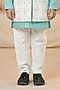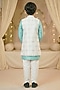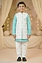 Featuring an off-white long jacket for boys in raw silk and cotton base. It is paired with a sky blue kurta and off-white pants. Style it with mojaris and a watch for weddings or sangeet ceremony.