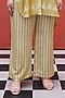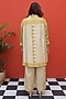 Featuring a mustard high-low shirt in modal satin base with ajrakh handblock print. It is paired with stripe pants. Accentuate it with stud earrings and flats for casual outing, get-together, brunch or family gathering.