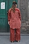Featuring a red long shirt in modal satin base with ajrakh hand block print. It is paired with striped pants. Accentuate it with stud earrings and flats for casual outing, get-together or family gatherings.