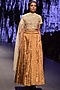 Featuring a gold lehenga skirt in tissue silk base. It is paired with contrasting silver blouse with full dabka embroidery and scallop dupatta.