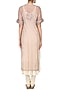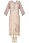 This set features a hand woven grey kurta in silk chanderi with french knots and scattered dabka embroidery on front and neckline. It comes along with mustard crushed anarkali and palazzo in cotton.