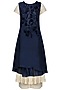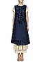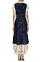 This set features a midnight blue wrap dress in silk chanderi base with parsi and velvet embroidery all over. It is paired with an off white crinkled anarkali and matching palazzo pants.