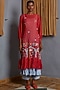 Featuring a strawberry pink dress in silk chanderi base with parsi and dori embroidery. It is paired with contrasting pants and an anarkali style inner.