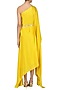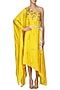 Featuring a mustard one shoulder asymmetric kaftan dress in satin cotton base with sequins and zari leaf motif embroidery all over along with elongated cape sleeve. It comes along with white embroidered tie-up belt.