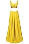 This set features a mustard yellow crop top in cotton satin base with sequins and zari leaf motif embroidery. It is paired with matching lehenga and front open short jacket in cotton satin with sequins and zari leaf motif embroidery all over.