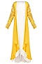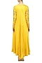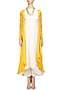 This set features a white straight plain kurta in satin base paired with matching white satin palazzo pants. It comes along with mustard yellow front open cape with sequins and zari leaf embroidery on the sleeves.
