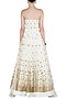 Featuring an off white lehenga skirt in net base with gradient sequins. It is paired with matching strapless high low cape blouse.