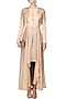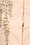 Featuring a pale pink high low cape in satin cotton base appliqued with gold gota patti work in bunch of leaves pattern on both sides of shoulders and cape sleeves. It has hook closure detailing and high mid slit on centre front.