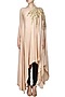Featuring a pale pink one shoulder long dress in satin cotton base appliqued with gold gota patti and sequins embellishment in bunch of leaves pattern on one side of yoke and along the shoulder. It is paired with black satin cotton pleated dhoti pants.