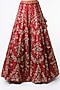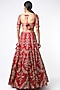 Featuring a red scalloped lehenga in raw silk base with nakshi and zari embroidery. It is paired with a matching blouse, a dupatta, and a veil.