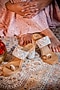 Featuring a pair of cream and tan block heels in faux leather base with shisha mirror hand work. It has a faux leather lining and 3-inch heels. Style them with ethnic ensembles or festive dresses for a graceful touch. Perfect for weddings, sangeet nights, and celebratory occasions.