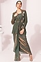 Featuring a moss green jacket in micro pleated two-tone tissue satin base with hand embroidery. It is paired with drape dhoti and a slip. Accentuate it with statement earrings and elegant heels for a stylish ensemble, ideal for festive gatherings, cocktail evenings or refined celebrations.