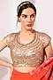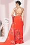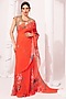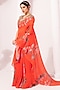 Featuring an orangey red micro-pleated pre-draped saree in georgette base with hand paint and digital print. It is paired with a hand embroidered blouse. Accentuate it with statement earrings and elegant heels for a stylish ensemble, ideal for festive gatherings, cocktail evenings or refined celebrations.