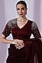Featuring a wine red pre-draped saree in micro pleated two-tone tissue satin base. It is paired with a hand embroidered blouse. Accentuate it with statement earrings and elegant heels for a stylish ensemble, ideal for festive gatherings, cocktail evenings or refined celebrations.