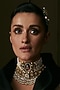 Featuring a gold finish choker necklace studded with ruby, kundan polki and pearls, set in alloy. This jewellery creates a refined and graceful ensemble, ideal for weddings, festive gatherings or evening celebrations.