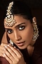 Featuring a gold finish maangtikka studded with kundan polki, ruby, green onyx and pearls, set in alloy. This jewellery creates a refined and graceful ensemble, ideal for weddings, festive gatherings or evening celebrations.
