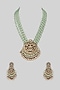 Featuring a gold finish long pendant necklace studded with mint kundan polki, set in mixed metal. It is paired with a matching pair of earrings. Add a touch of sparkle to your ensemble, perfect for wedding ceremonies or festive celebrations.