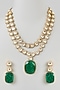 Featuring a gold finish long necklace studded with moissanite polki and green onyx drop, set in brass. It is paired with a matching pair of earrings. Perfect wear for festive occasions or wedding ceremonies.