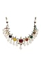 Featuring a 24 kt gold plated necklace studded with green onyx and pearls, set in brass. It is paired with a matching pair of earrings. Perfect for grand occasions like weddings and traditional festivities.