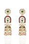 Featuring a pair of 24 kt gold plated jhumka earrings studded with red and green pearls, set in brass. Perfect for grand occasions like weddings and traditional festivities.