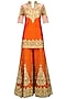 This set features an orange short kurta in dupion base embroidered with gold gota patti work on front neckline, sleeves and hem. It is paired with orange sharara pants with gold gota patti embroidered bootis . It comes along with a net embroidered dupatta.